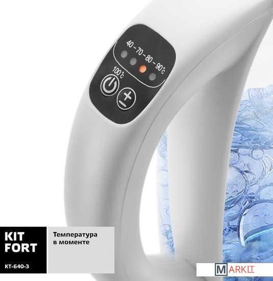 Электрический чайник с электронным терморегулятором Kitfort KT-640 может не только вскипятить воду, но и нагреть ее до температуры 40, 70, 80 и 90 °С, что очень удобно при заваривании различных сортов чая. Температура 40 °С пригодится для приготовления детского питания. Чайник также оснащен функцией поддержания температуры. Температура воды контролируется встроенным в дно чайника термодатчиком.